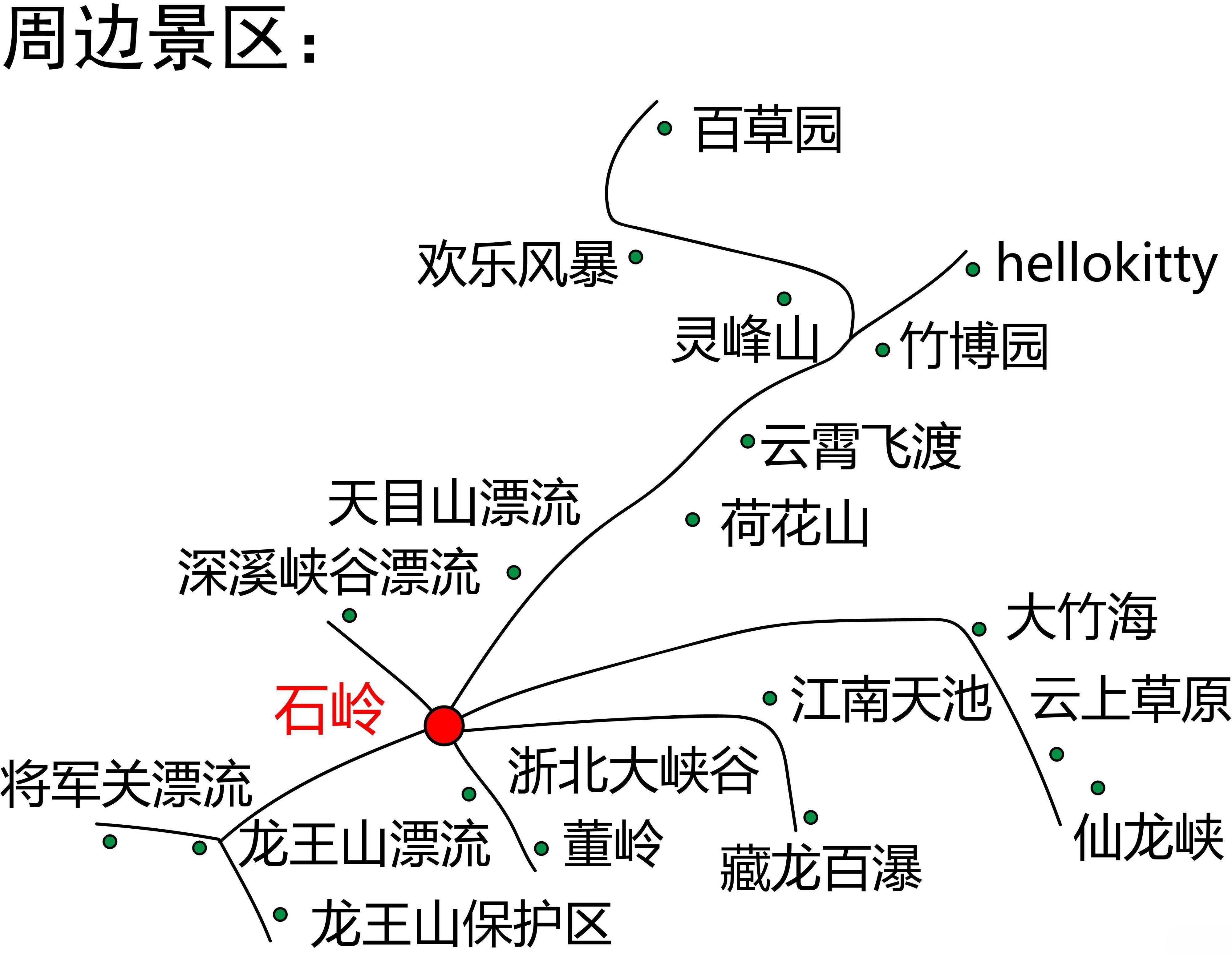 江南天池,中南百草原,安吉中国大竹海,浙北大峡谷,藏龙百瀑(均在20分钟车程内)