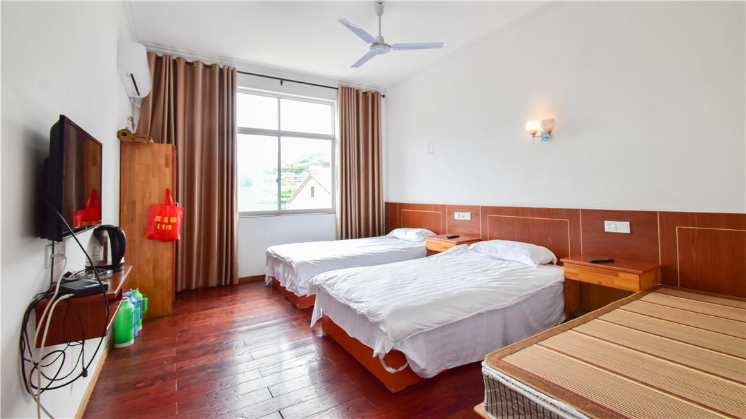 客房:能同时入住60人左右,房型有标间、大床房、三人间。房间均配有中央热水器,24小时供应热水,床单被套一客一换。
