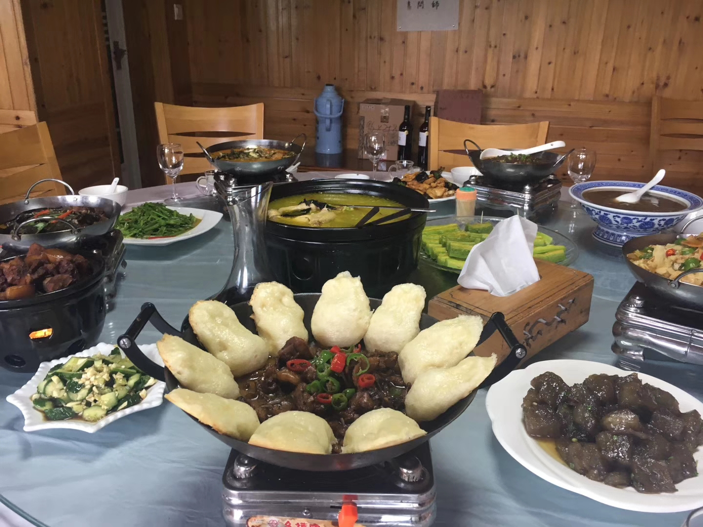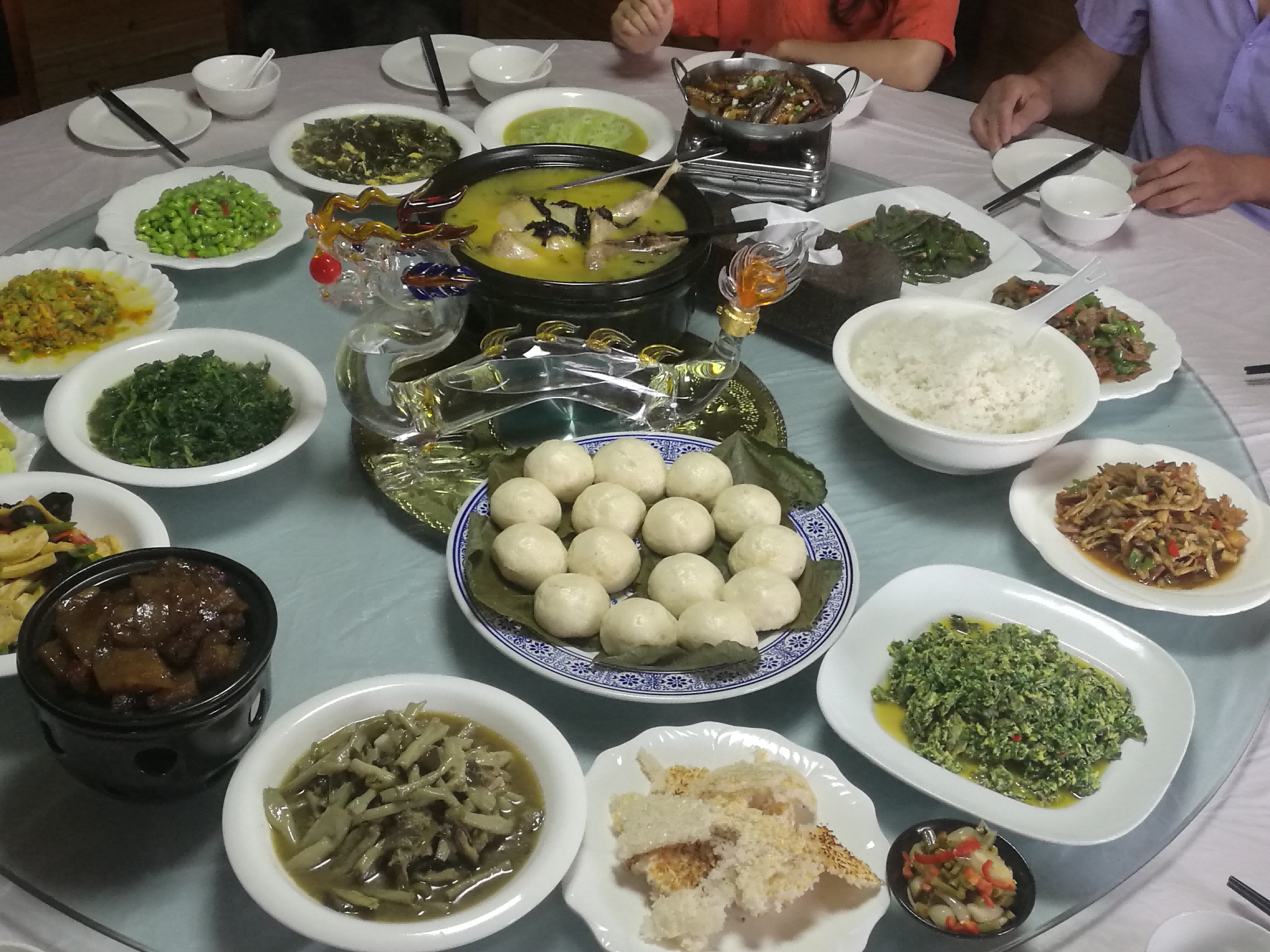 卧龙山庄在天柱山山高林密的生态资源种植高寒蔬菜,养殖山养、黑猪、山鸡,特别是鲜鱼不仅富有观赏性,而且是生态园农家菜着的一大特色,游客在此可以吃到热气腾腾的石耳炖土鸡,山羊排,还有香喷喷的红米饭,南瓜汤、豆腐乳等独具地方风味的的农家美食。