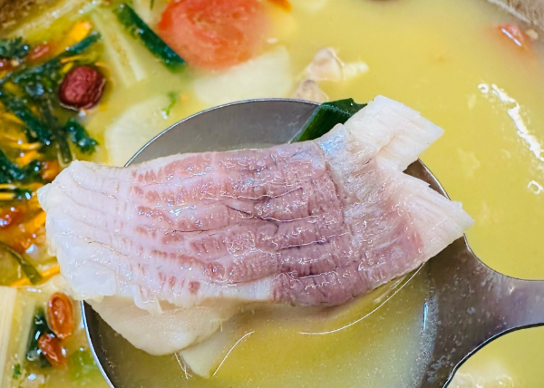 这道菜刀工精细,鱼色乳白,口感鲜美,清甜嫩滑,汤汁鲜香浓郁,鱼肉吸收了高汤的鲜味,入口即化,令人回味无穷。